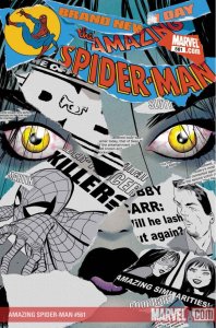 So kudos to Dan Slott for a tremendously enjoyable script and Marcos Marton for truly wondrous pencils and inks – after an odd rendering last issue, his MJ is spot on here; Paper Doll has weight where she needs it, and lightness elsewhere; and Spidey continues to be Martin’s own mix of Ditko and Romita Sr, while looking better with each panel. And Martin’s clipped-out-by-a-stalker cover is the cherry on the cake.