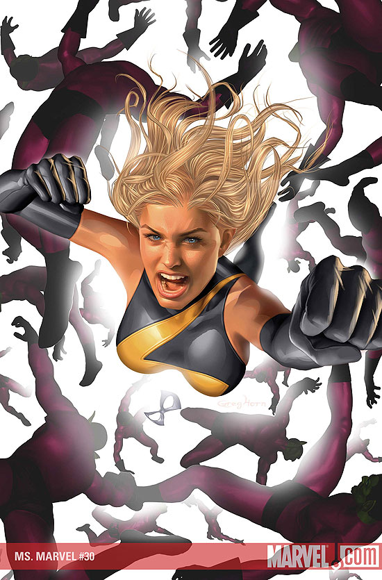 Look at that cover, the logo’s got it wrong . . . that’s not Ms Marvel, it’s Ms Modok. Seriously, when did her head get so big? It’s almost as if artist Greg Horn Photoshopped one body and a different head and combined them into one image, without quite getting them in proportion.