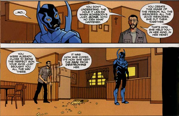 More impressive still, after giving his son the information he needs to reconsider his decision, Alberto drives Jaime to his next mission, a battle with the goons of the new Dr Polaris. And he backs up his son, with cane – he has a gammy leg – and firearm. There’s no ‘leave this to the older heroes’ from Alberto; he trusts his boy to do a good job with the powers he’s been given by aliens, and the values he’s been given by himself and his wife, Bianca.