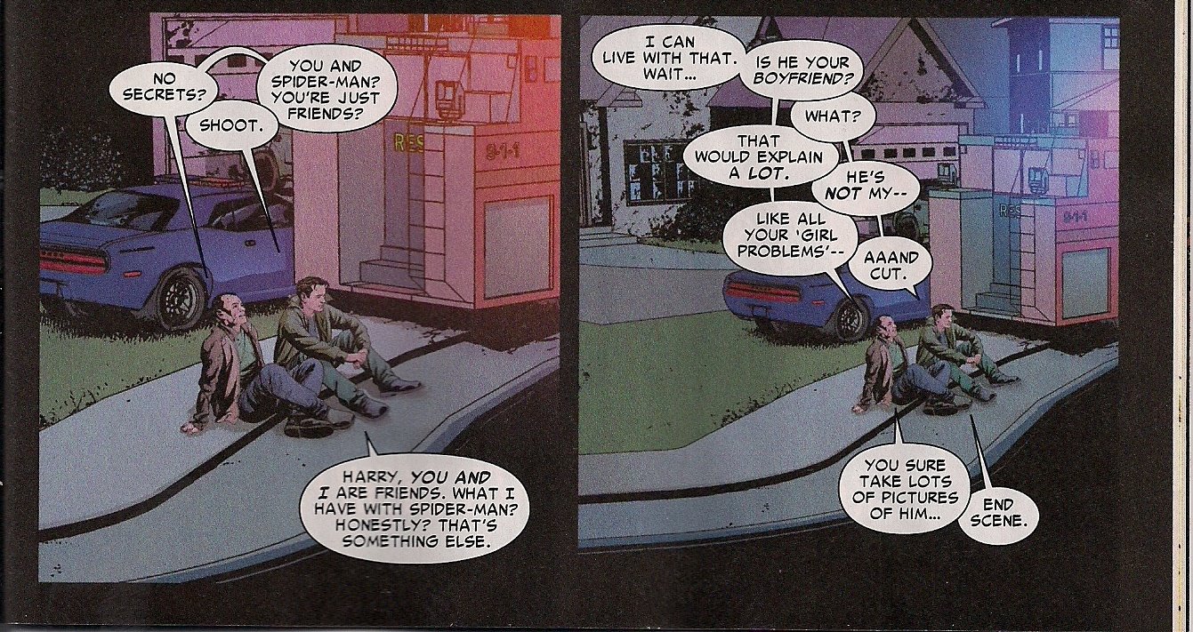 Yes, I’m in a fluffy bunnies positive mood and you know why? Because of the final scene with Peter and Harry acting, for the first time in several decades and God knows how many realities, like the best buds they’re meant to be. OK, there is the little matter of Peter not reminding Harry he’s Spider-Man, but that never ends well.