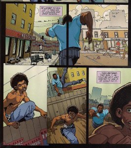 The rest of the script is equally intelligent, as we’re introduced to various members of Black Lightning’s family. Van Meter masterfully weaves the daughters and niece Joanna into an integral part of the story. And some nice small touches find their way into the artwork, such as the graffiti which makes Southside into Suicide Slum and the renamed trophy cabinet at Jefferson’s school.