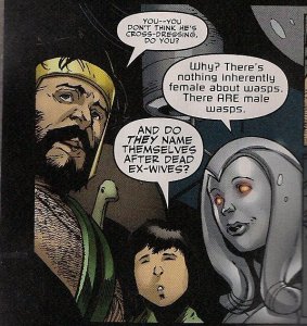 On a similar quest are Hercules and Amadeus Cho, self-proclaimed ‘seventh smartest person on the planet’ and probably the most irritating. His smugness links into the title of this issue, ‘the Smartest Man in the Room’. Is it Cho, is it Hank Pym, is it Tony Stark? The question allows Slott to give us another peek at his approach to Pym (after the recent Requiem special, see http://dangermart.blogspot.com/2008/12/secret-invasion-requiem.html). He’s still a tad tortured but ready to step up when prompted, and actually demonstrates a sense of humour. The best lines, though, go to Hercules, for example, after Pym announces his new code name, a tribute to recently departed ex-wife Janet Van Dyne, the Wasp.