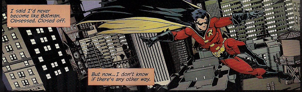 The splashy fighty scene with Lady Shiva (truth be told, a boring little madam) is equally good, as is the quiet Batcave scene Nicieza supplies for Tim and Jason Todd.