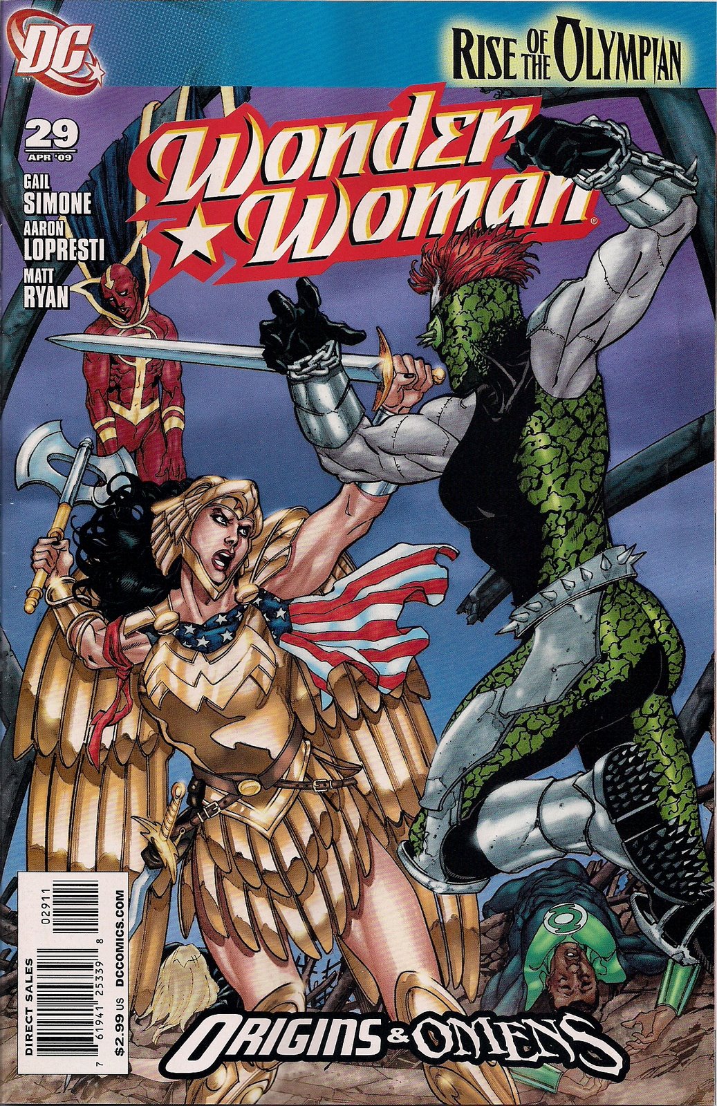 Hey Kids, it’s Origins and Omens time again! Despite the fact that Simone told us Diana’s origin only last year, the DC-wide mini-stunt demands she do so again. Happily, there’s a new wrinkle here, telling us just where Hippolyte got the mud from to make her clay baby, thereby explaining why the rogue Amazons of the Circle consider Diana a dangerous ‘dragon’. The set-up has Hippolyte visiting the injured Tom Tresser in hospital (as opposed to helping Diana out, as she’s in the area, but hey, this is Stunt Month) and it works well enough but heck, Tom gets about two lines of dialogue and one makes him seem an idiot. If he doesn’t start acting like the real Nemesis soon I may have to give up on the guy . . . hopefully he’ll be more himself come his featured role in the six-issue Final Crisis Aftermath: Escape.