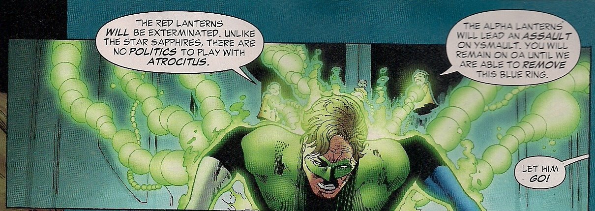 That aside, there were some things I liked about this issue. The artwork by penciller Philip Tan, inker Jonathan Glapion and colourists Randy Mayor and Gabe Eltaeb, is a joy to look at; Orange Lantern Larfleeze is an amusing fellow, an evil Muppet with a three-year-old’s views on sharing; and the Guardians are hilarious, the way they throw tantrums at every opportunity, declaring new laws like Queenie in Blackadder II; and the simpering Blue Lanterns are, as ever, a hoot – if Walter the Softy from the Beano were given a power ring, it’d be blue.