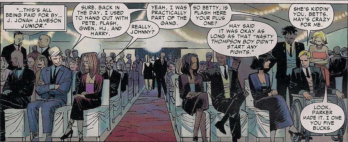 But that’s not all – this is a 104pp issue with no ads, allowing room for stories by the rest of the Spidey Web-heads, writers Mark Waid, Bob Gale, Joe Kelly, Marc Guggenheim and Zeb Wells.