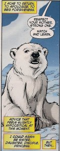 Awwwwwwwwwwwwwwww, how to win over a reviewer – begin the book with cute snow beasties. Here we see that Aaron Lopresti draws polar bears every bit as well as he draws albino gorillas. The heck with Wonder Woman action figures, I want a Lopresti plush (a bear, that is, not a plush of Aaron Lopresti …). Diana’s in the Arctic, thinking sad thoughts about last issue’s rejection of the Amazons, hoping that as Superman finds succour there, so shall she. It doesn’t work so she’s soon back at her apartment in Washington DC for a quick, amusing scene with her ape followers. Bet I’m not the only one who let out a ‘fnar fnar’ when Toliphar referred to Nemesis as ‘That human. The one who can’t use his spear.’