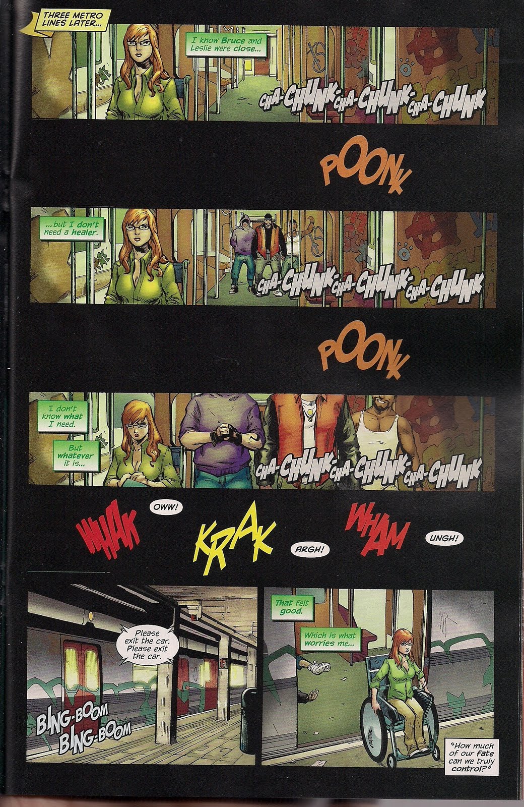 There’s also a sequence with Babs and all-purpose doctor Leslie (‘What do you mean, my parents wanted a boy’?) Thompkins watching Wendy Harris play wheelchair basketball. Wendy, in case you don’t know, is the daughter of overused DC villain the Calculator and was recently crippled in Teen Titans. Leslie suggests the similarly disabled Babs – remember, only men in the DCU get cured of paralysis – help Wendy with her emotional rehabilitation, but Babs is busy being angry and grim.