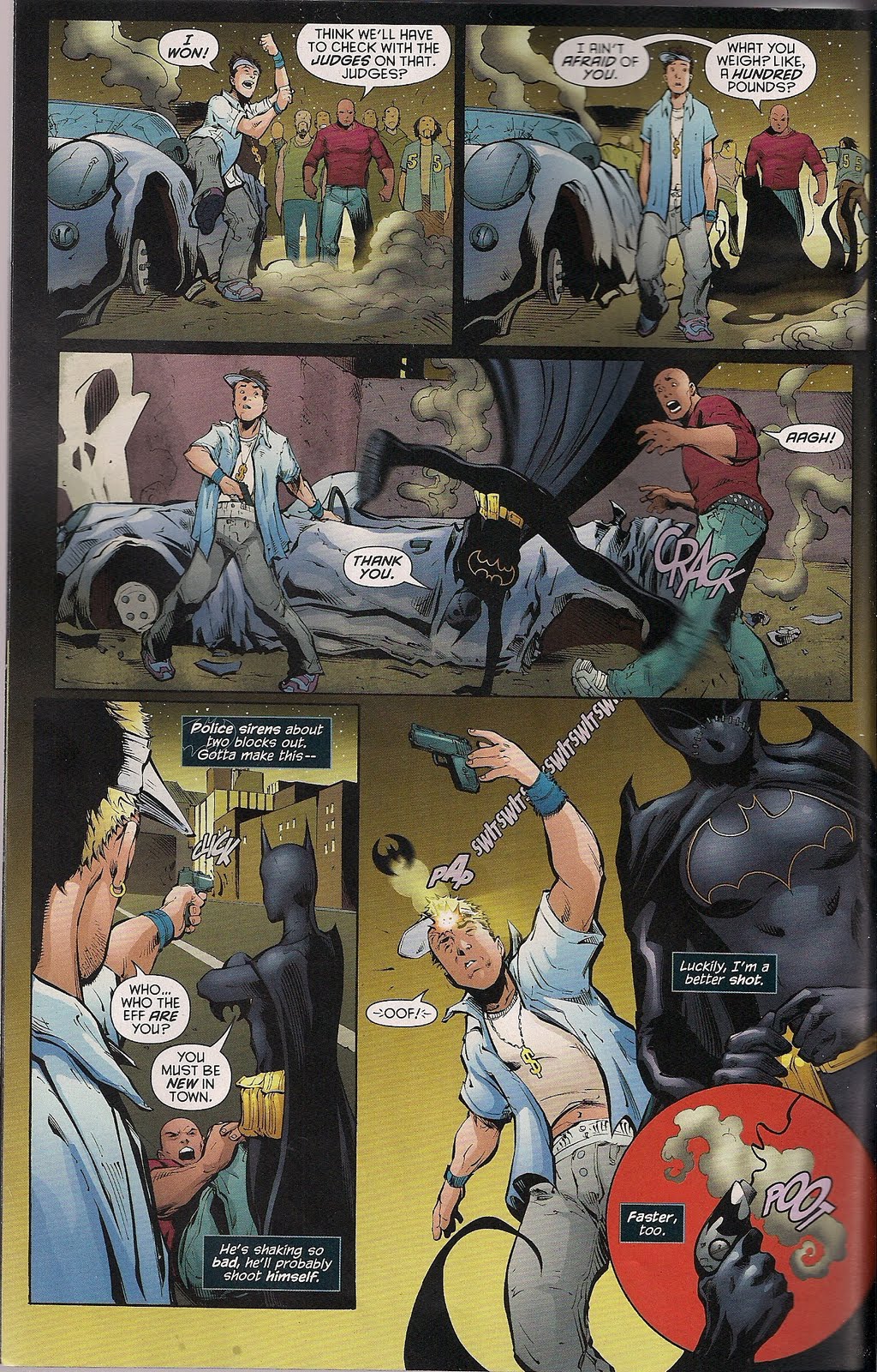 The opening scene isn’t the most exciting. Batgirl is trying to stop some kind of illegal street race. As I understand it, whoever races the organisers would have their cars, possessions and life removed. So why anyone was actually accepting the challenge is beyond me, as it’s not like Gotham’s lowlives don’t talk among themselves. Batgirl manages to stop the current race by tossing herself onto the windscreen of a speeding car from a great height and not dying – that’s some bat-armour she has, and her stability must be that of an Olympic gymnast. This apparently causes both cars to crash, she confronts the drivers and puts one of them out by kicking his knee. From a handstand position, even though she’s right next to him in the previous panel and could have just kicked the guy without the cheerleader acrobatics. Then the other fella is about to shoot her but is knocked out by a batarang thrown by one of the over the page guest stars. Batgirl’s narration indicates that she was about to do something to stop him, but her back’s to him all the while and she doesn’t notice that someone else has taken care of her problem.