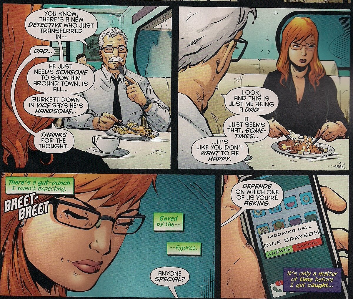 Interspersed with Steph’s flashbacks, showing that the girl has that crimefighting bug bad, we join Barbara Gordon, the first Batgirl (as opposed to Bat Hyphen Girl, Betty Kane), for another of those moody dinners with dad, Commissioner Jim Gordon. Sometimes she’s happy, usually she’s sad, but always she’s keeping her feelings from a man who is a million miles from Dumb, and one of the most trustworthy people in the DCU. I can never remember if he knows Barbara was Batgirl and is Oracle – hey, it’s like I’m a DC editor! – but here it seems he knows something.