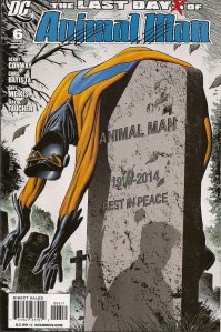 The man himself provides his final Animal Man cover (for now, he said optimistically)and it’s a keeper. I especially love the brilliantly corny use of the leaf to hide Animal Man’s birthdate.
