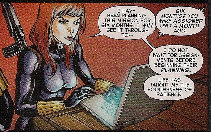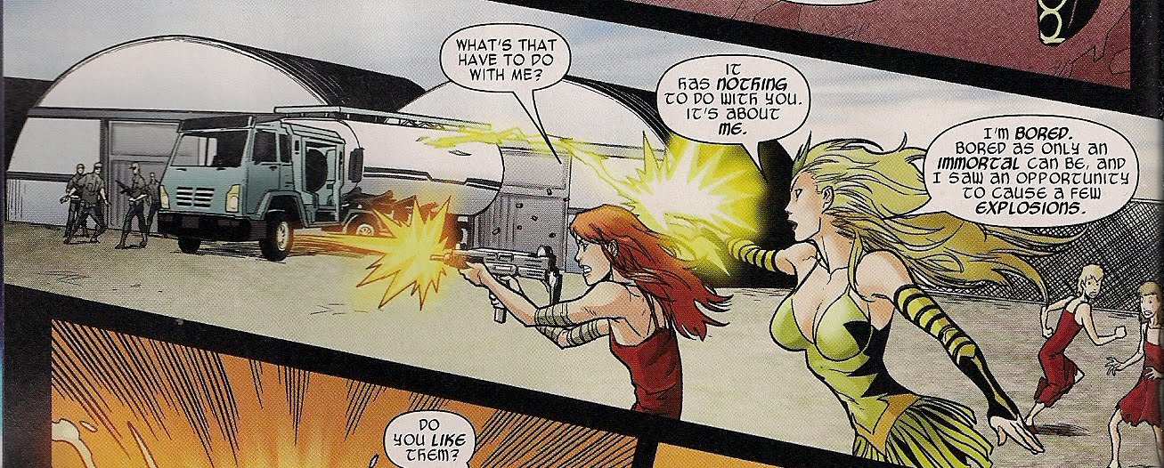 I’d not heard of this book until I saw the iFanboy listing for this week’s comics, but the prospect of Black Widow teaming up with four other Marvel women has a certain appeal. First off we have the Asgardian Enchantress – that’s Amora – teaching the young Natasha Romanov a lesson that will stand her in good stead. The flashbacks to Tasha’a training alternate with her current mission, getting a fatcat arms dealer out of his panic room (if he learns a lesson, it’s to hire gay security men).