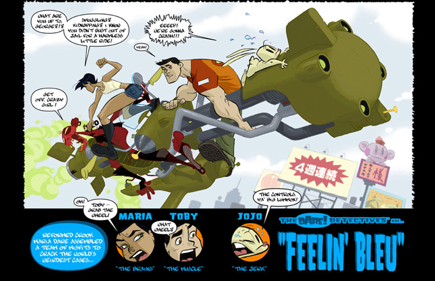 This is my first exposure to Ben Caldwell’s comic and it’s a delight. Maria and co have likable, well defined-personalities revealed through the action, which pummels through each 96-page episode like a rollercoaster (click to big up). The character designs are ridiculously attractive, from cute and feisty Maria through instant gay icon Toby, glamourpuss vixen Madame Bleu and beyond, in a Chinatown that’s a glorious combo of noir and neon. The confident script is full of snappy, sassy dialogue, the artistic ‘camera’ never stands still . . . Dare Detectives is a tour de force from an artist who really knows his craft and if Disney, Pixar or whomever don’t pay Ben big bucks for this property and put the Dare Detectives on the big screen, they’re nuts. Heck, he’s done all the hard work already.