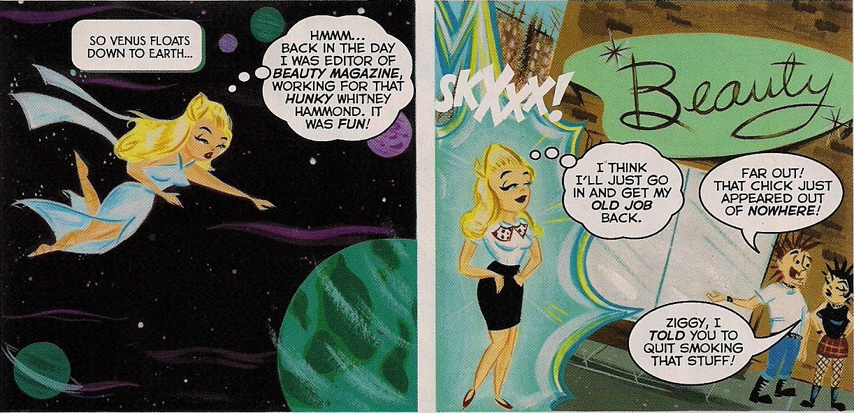 Venus, of Agents of Atlas fame, solos in a tale which has her betting Zeus that her powers of femininity are as strong as Hercules’ strength. So it’s off to Manhattan for an adventure involving supermodels and secret affairs. There’s a hilarious gag which shows that even a burka can’t stop Venus recognising . . . oops, can’t spoil that! But this is adorable fluff from Trina Robbins, here writing ‘only’, for the terribly talented Stephanie Buscema, whose retro linework is simply joyous.