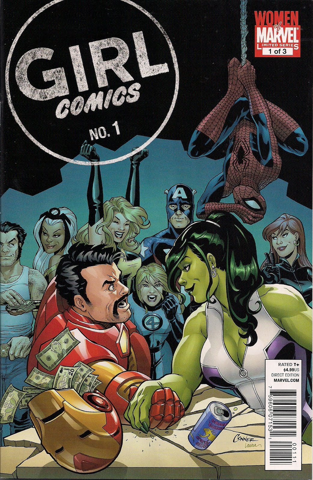 The cover’s by Amanda Conner and as delightful as I’ve come to expect from her, with She-Hulk – whose 30th anniversary has ignited Marvel’s current female focus – beating Iron Man at arm wrestling, watched by the the fine ladies and gents of Marvel.