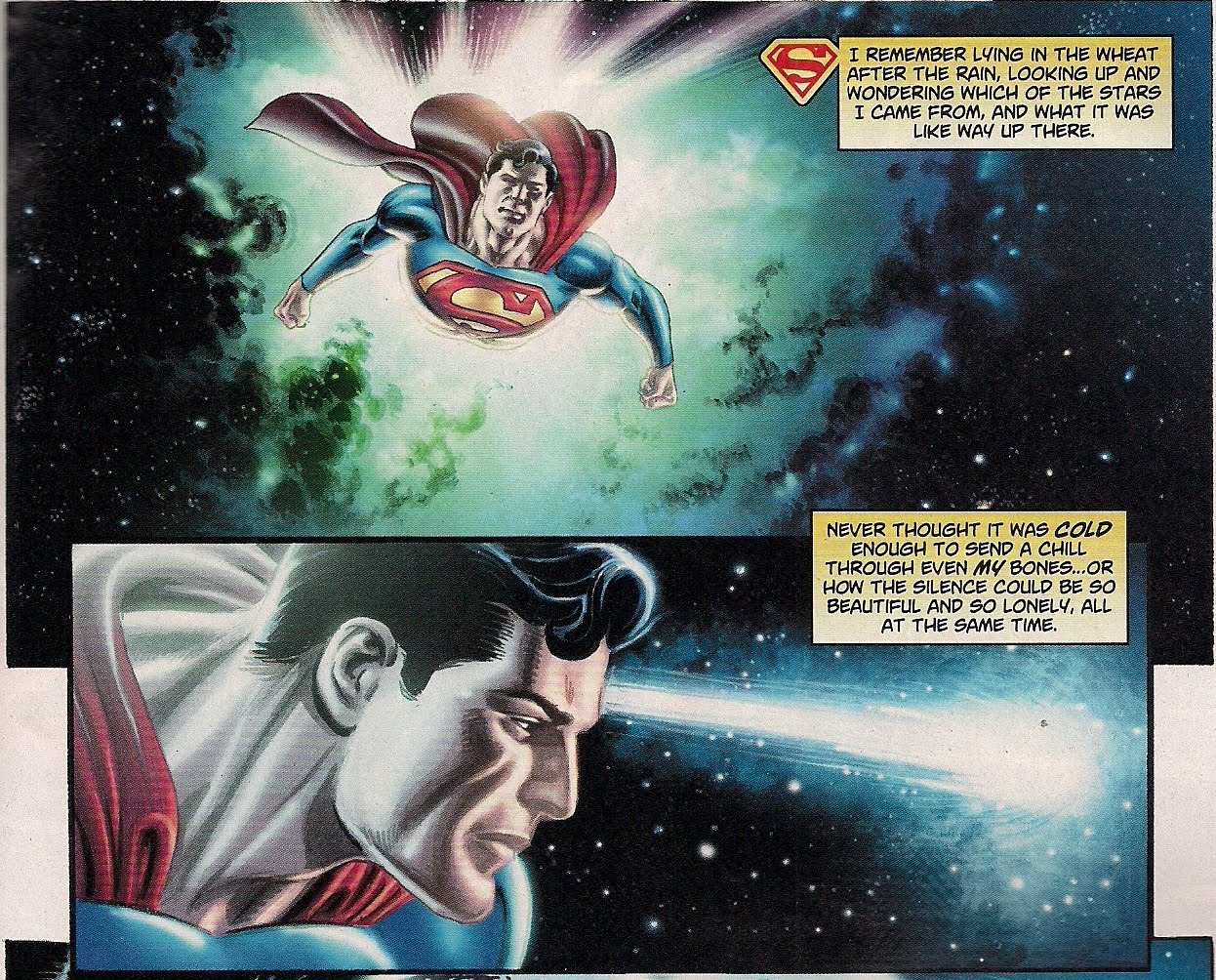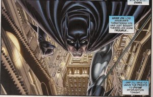 There is internal narrative in the usual icon-appended boxes – well, thought bubbles are so passe! – but it’s speaking more to personality and situation than mutual adoration. So we have Superman awed by the beauty of the universe even after his many space trips, and Batman bemoaning the bright lights of Metropolis. Whereas this kind of thing can feel contrived, as writers strive to show their cleverness, here the monologues seem natural – these are the thoughts the heroes would be having, given their natures. And while we don’t see them together, the Batman/Superman friendship is evident in other ways.