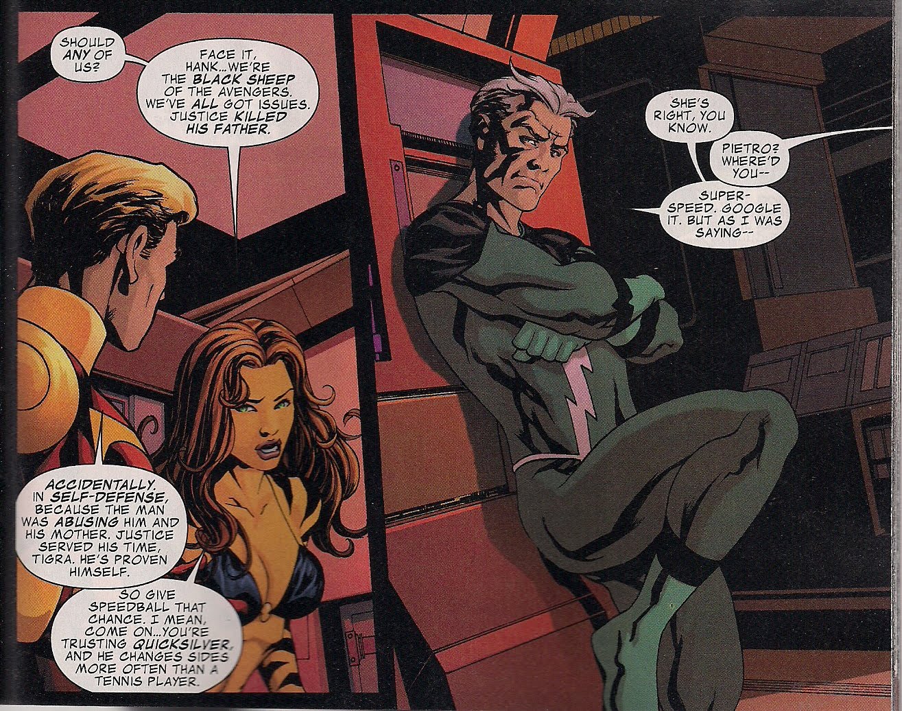 As it is, there’s room to catch up with Speedball, newly costumed by House of Marvelman for his post-Penance period. We see Tigra get some respect, and Quicksilver’s view of his tumultuous past. Hank’s mental problems are brought up in a way that encourages the belief they won’t be a monkey on his back, and Justice, we see, looks set to be an accidental heartbreaker.