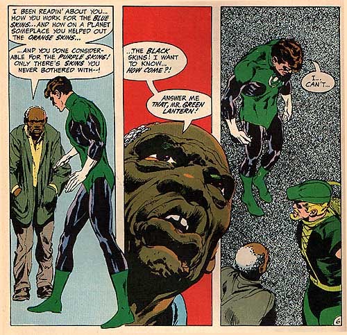JMS sets up the coming ‘Grounded’ storyline, in which our hero will walk across America to connect with the people, via a scenario familiar to longtime comic fans. It’s the classic – yet senseless – scene from 1970’s Green Lantern #76 that prompted Hal Jordan to drive across the US with Ollie Queen rather than protect an entire space sector (click to enlarge). Forty years later … Yes, same idea. A man on the scene reasonably points out that Superman can’t be everywhere, but screw that is Angry Lady’s response – he missed helping her fella, that makes him scum. Superman is speechless throughout her rant, but once she’s flounced off he springs into action. He’s soon off chatting to Batman about the type of injustice the JLA tackles and mystifying Flash with inane questions about what he notices at super-speed. Then it’s a mournful glance at the snapshot of the dead husband Widowoman tossed at him, an even pappier than usual Pa Kent memory about being in touch with the soil, some handling of present day muck by our literal-minded hero and a wander off into the distance on foot, as bemused little boys assume there must be an important reason he’s not flying. Sorry, kids. Well, if you’re not going to be using it Superman, give me strength! Superman’s going to be wandering across the US for a year because a grieving woman threw some ill-considered, selfish words at him? Singularly unable, or unwilling, to defend himself, Superman looks like a dumb loser, falling in with the expectations of others rather than managing them.