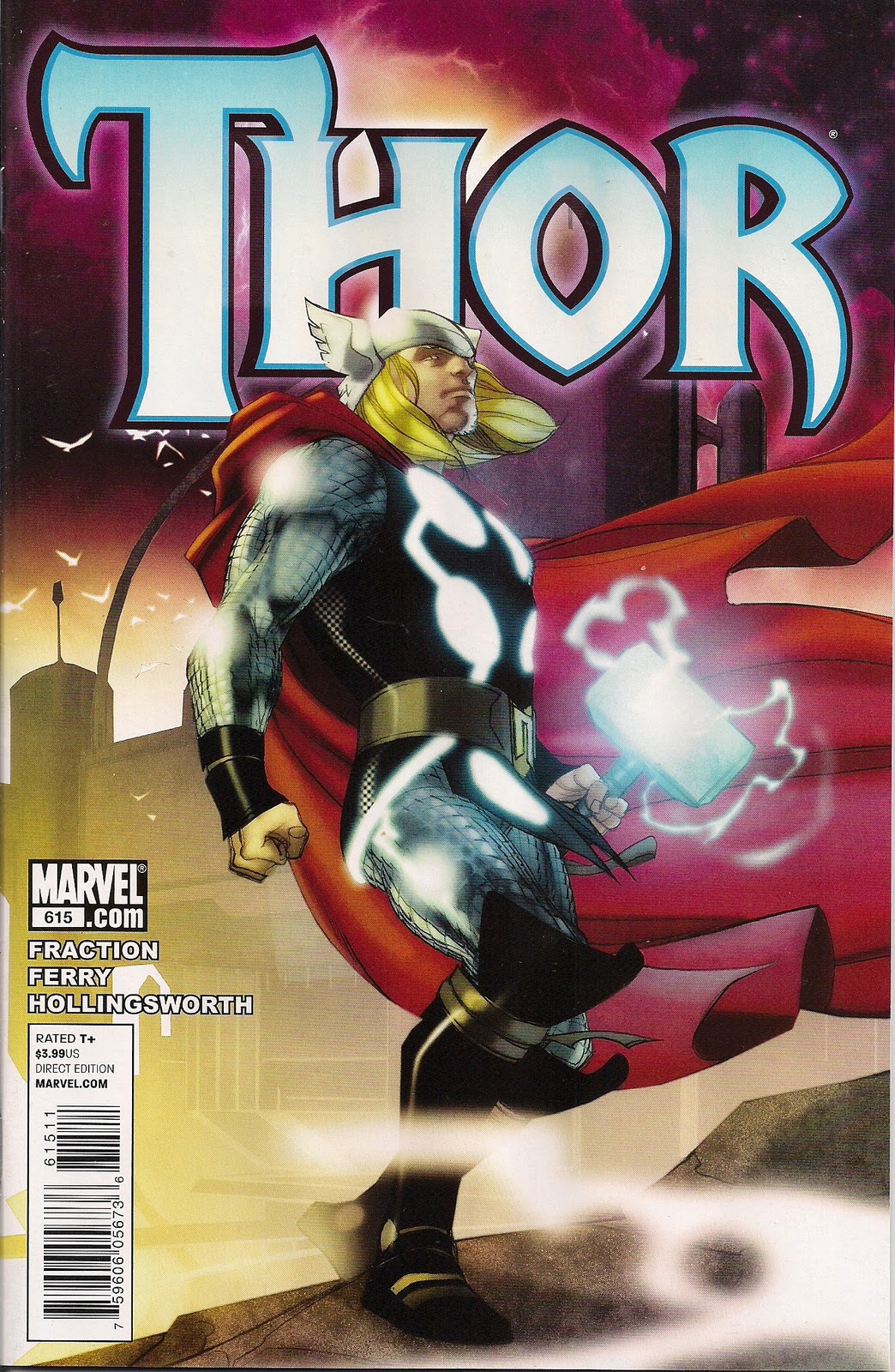 So far as Ferry’s art goes, there’s pleasing variety in the page constructions, but they’re not showy – they simply works. He reigns in the super-broad Norseman face preferred by recent artist Olivier Coipel, for features that anticipate the look of actor Chris Hemsworth in next year’s Thor movie. And he’s adding some Kirby Krackle to the down-to-earth duds of recent years, making our hero look the god he is.