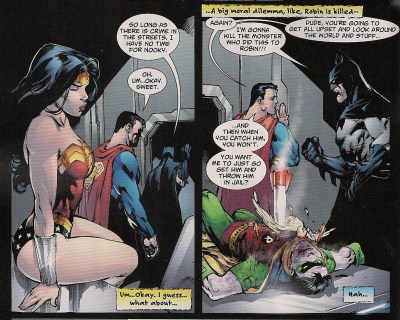 Power Girl wants to help Huntress rescue folk after a Gotham earthquake. Huntress tells her: ‘We don’t need your help’ (any people trapped beneath the rubble might disagree).