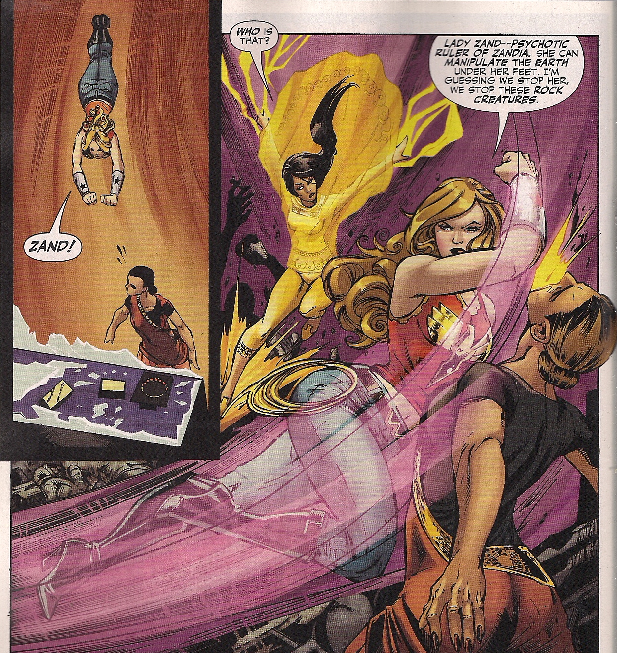 She’s had a page or two in recent Teen Titans issues, but here we get our first look at solar-powered Solstice in costume and action. And Kiran looks like a keeper – powerful, wise and perky without being cocky. She’s just what Cassie needs to stop her falling into a funk as she ponders her unyummy mummy and feckless father.
