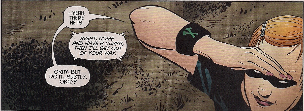 But while this issue is packed, it’s not crowded. Paul Cornell is an excellent writer, able to produce an elegant, inspired script that balances tussles with tenderness. Yes, there’s a very British sensibility, but beyond that, there’s a universality – these superhumans are more human than super. If you’ve ever been on a first date, the gaucheness of the Squire and the Shrike will strike a chord. If you’ve ever had to face up to your weaknesses, you’ll know how Cyril feels here.