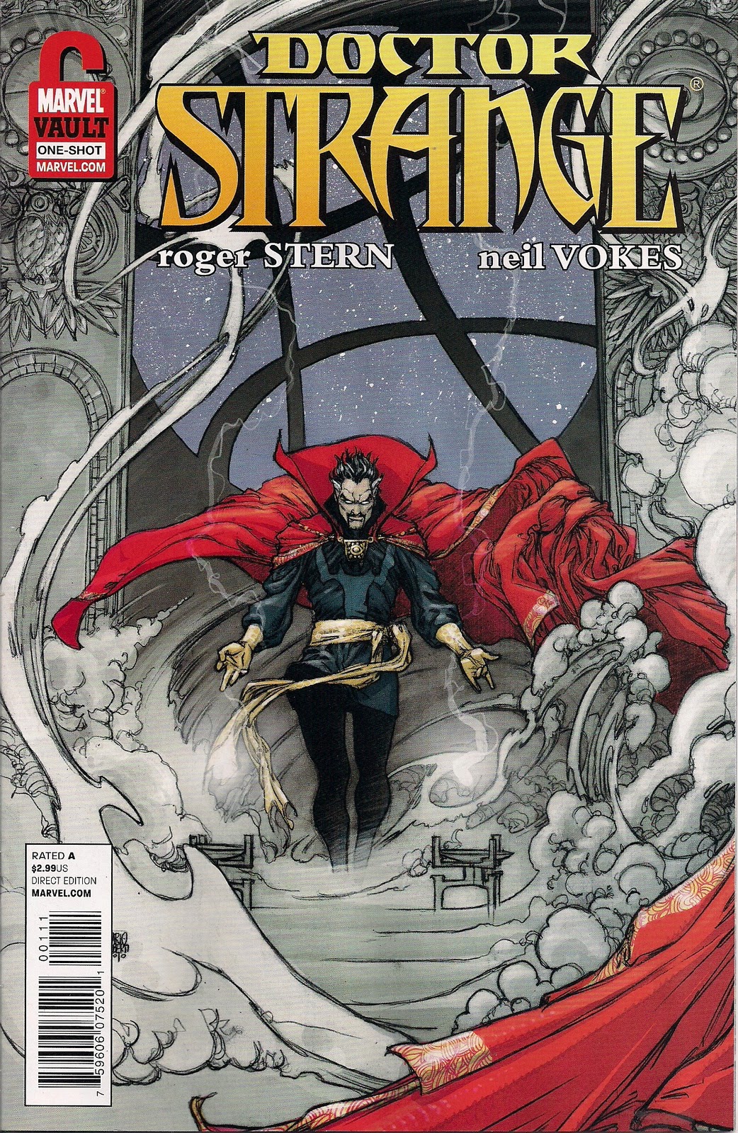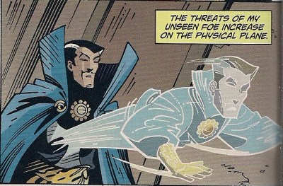 It’s a simple little tale – Doctor Strange fights minor demons as his past is recapped. Stern’s script is stylish and efficient, with a nice line in magic spells that actually scan. And penciller Neil Vokes evokes the mystic realm with aplomb, homaging original artist Steve Ditko while weaving his own magic. He captures the angular appeal of original Strange, and it’s a treat to see that old blue smock and Cape of Non-Levitation again. (There’s also a wonderful panel of a flailing maiden being sacrificed that looks to be pure Mad! era Wally Wood; deliberate or not, I loved it.)