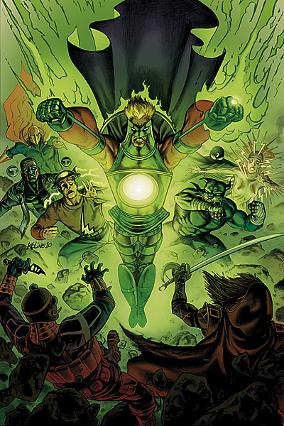 It’s been a long few months, waiting for the story that went with this cover. When it was solicited by DC I could barely type for laughing. Alan Scott’s new Green Lantern look is noted within the tale, the conclusion to Supertown, but incredibly, not one character tells Alan that he looks ridiculous. I get that everyone’s pleased he’s working around a spot of paralysis, but seriously, Wildcat is on this team. And Blue Devil. And walking case of foot-in-mouth disease Cyclone, for crying out loud.