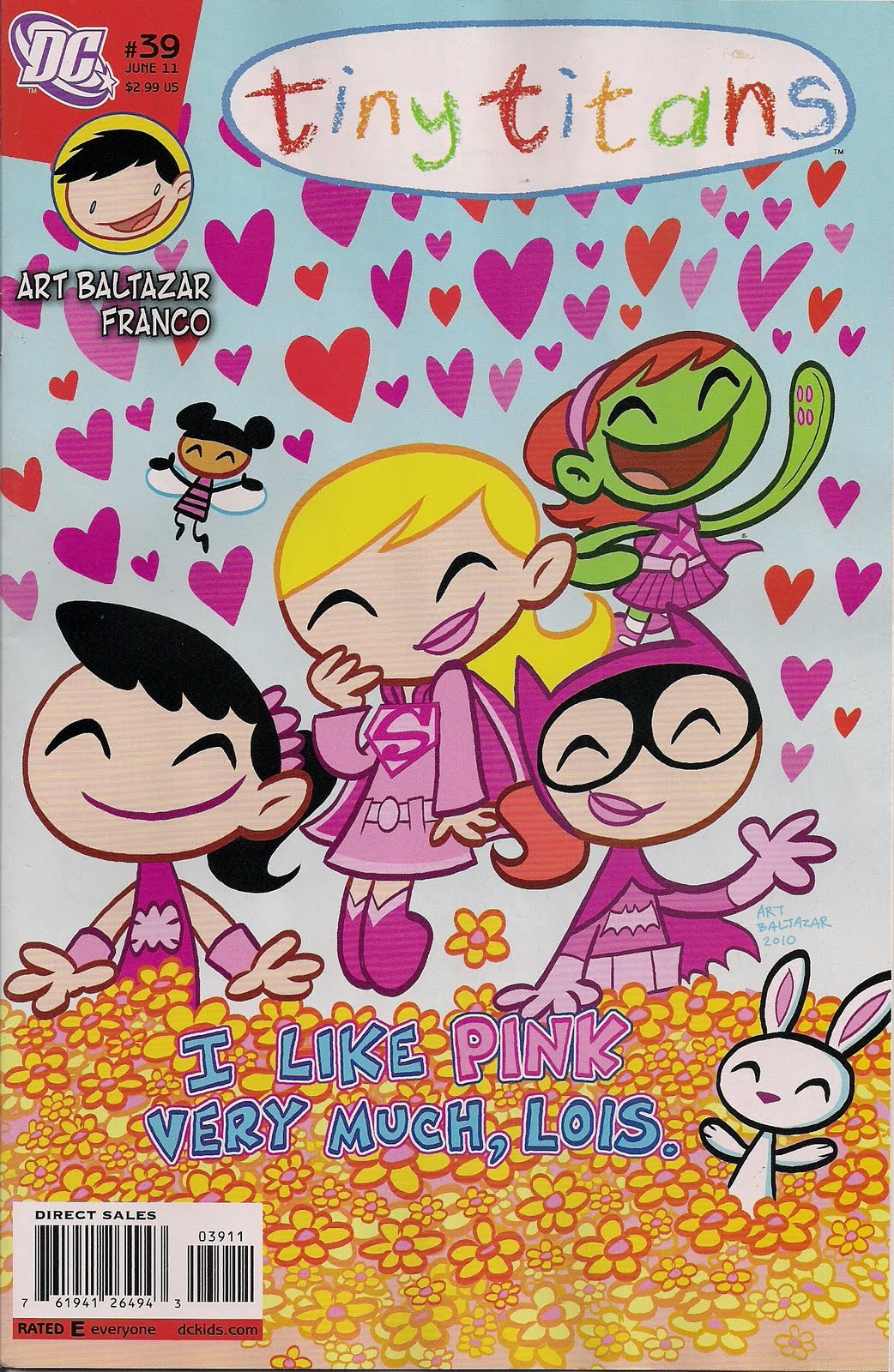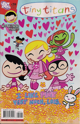 Who knew that so many great gags could centre on the girliest of colours, but this issue of Tiny Titans gave me the most smiles of any comic in ages. Take baby Damian and ‘Miss Cassandra’, for example (click to enlarge):