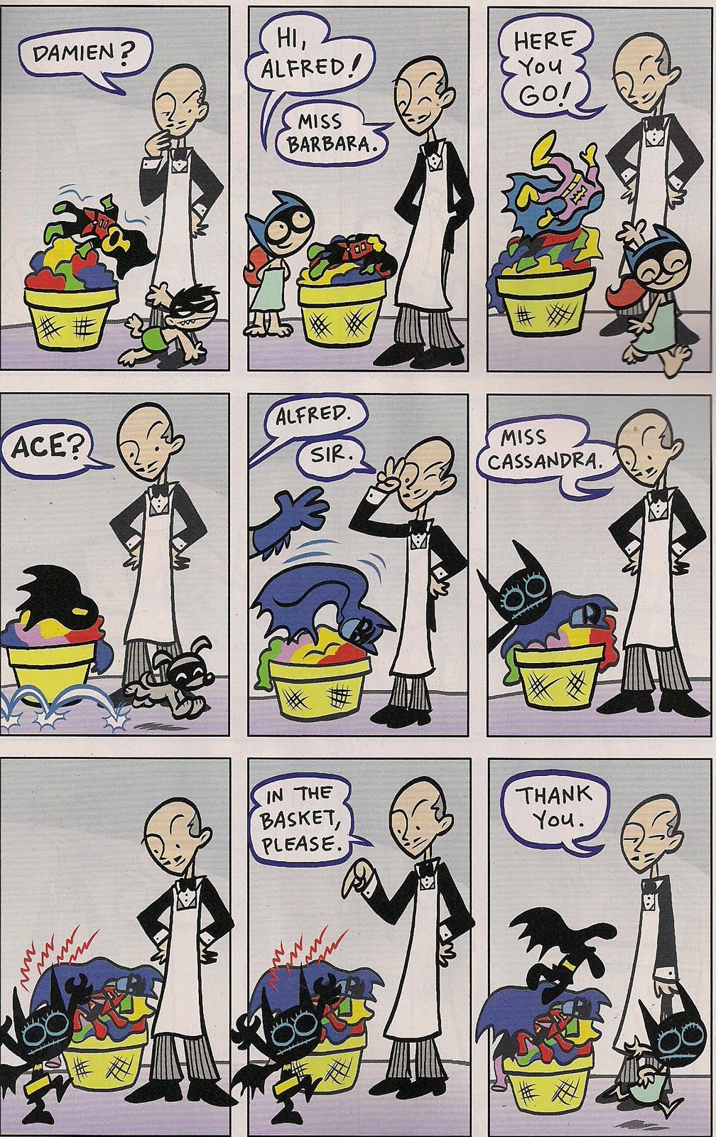 I like this issue very much. A washday accident at Wayne Manor – Supergirl puts a batch of S-capes in with the Batman Family’s more dour laundry – unleashes a plethora of pink pants. The likes of Batgirl and Supergirl are thrilled, Robin and Superman less so.