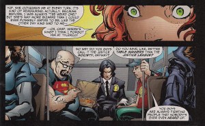 I can only assume Sturges was rushed, or downhearted, as he’s a much better writer than this issue indicates. One amusing oddity, though, is this self-referential panel, which just turns up for gag value. I’ll include the previous panel, so you can get a flavour of the rest of this issue (click to enlarge). And yes, I know Cyclone is a motormouth, but the things she says aren’t usually dumb.