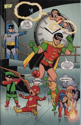 The core creative team of writer Sholly Fisch, penciller Rick Burchett and inker Dan Davis crafts another little gem here. Fisch gives us a good thematic hook, clear plotline, entertaining framing sequence, character development, meaningful action, a joke or two … apparently Fisch is a rocket scientist. He’s come up with a hymn to DC history which, I think, could easily be enjoyed by someone as their first comic.