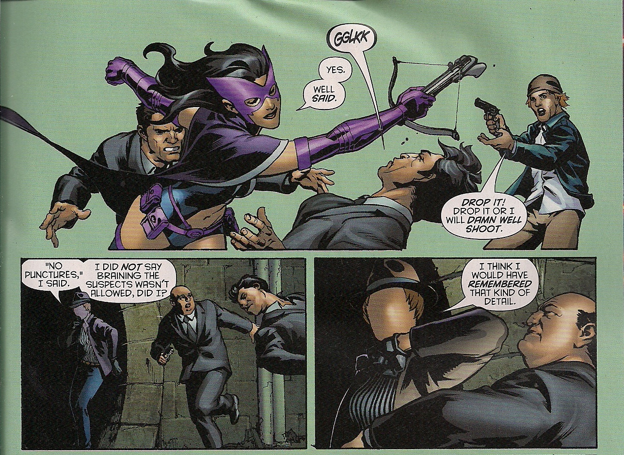 You’ll have realised that Miss Hargison and colleagues are Birds of Prey, but if you’re assuming it’s Black Canary taking point, think again. For Miss Hargison is Zinda Blake, ace pilot Lady Blackhawk who, as a literal refugee from the Forties, knows a thing or two about playing the femme fatale. While she distracts Tripe, having persuaded him to leave the new help outside, Dove and Black Canary attempt to get into the crimelord’s private quarters via perilous means, while Hawk hangs around upstairs and proves a less than natural espionage agent. But he looks fantastic in a chauffeur’s uniform.
