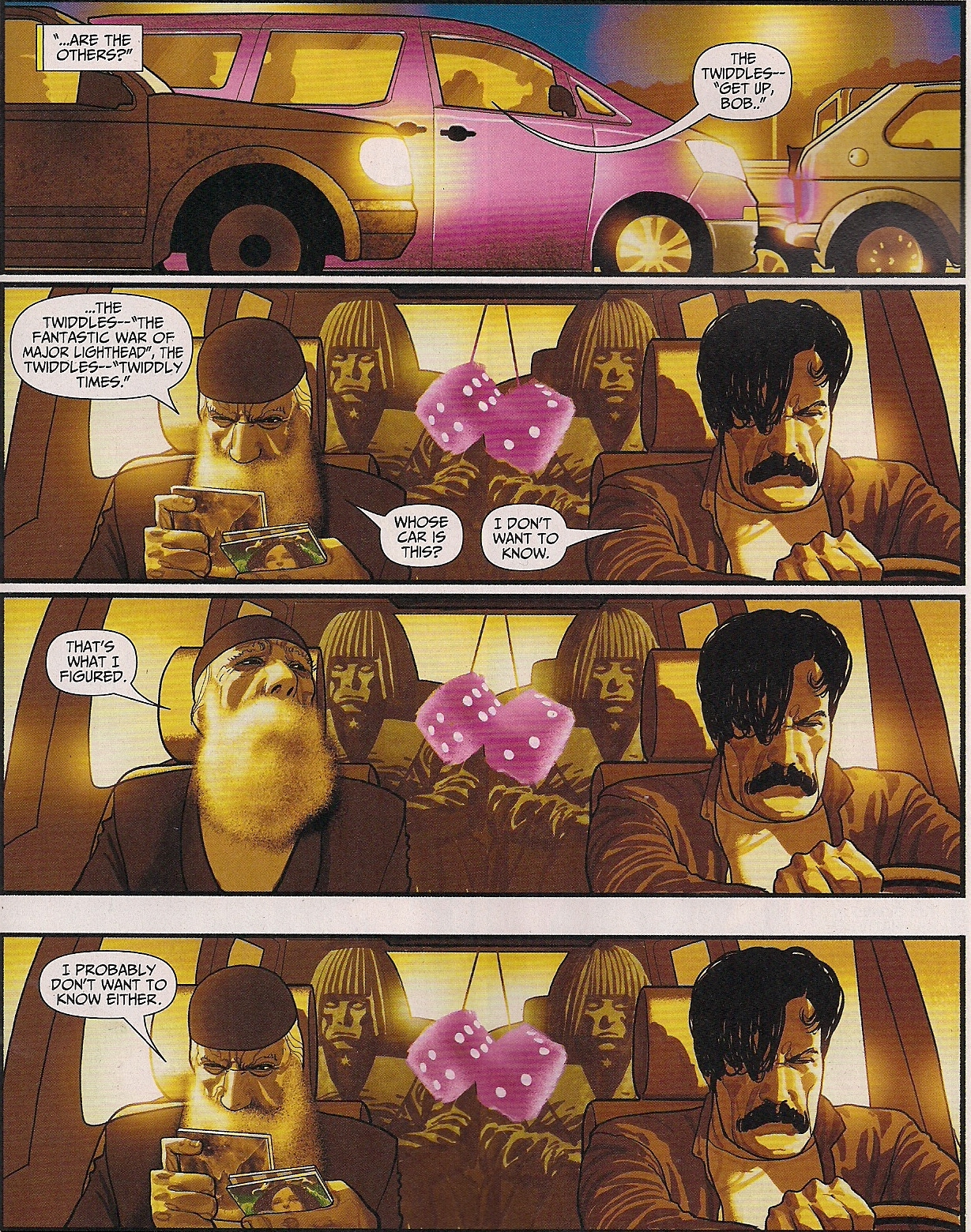 It’s typical of John Rozum’s meaty script that a cliche becomes a highlight. Even expository captions that could kill a story dead are a joy to read because they’re lyrically written, full of fascinating ideas. While this is part three of a complex tale, I’d nevertheless recommend anyone who hasn’t tried Xombi to risk $2.99; enough details are present to allow a newbie to jump in, and I doubt anyone could fail to be fascinated by the players (click to enlarge).