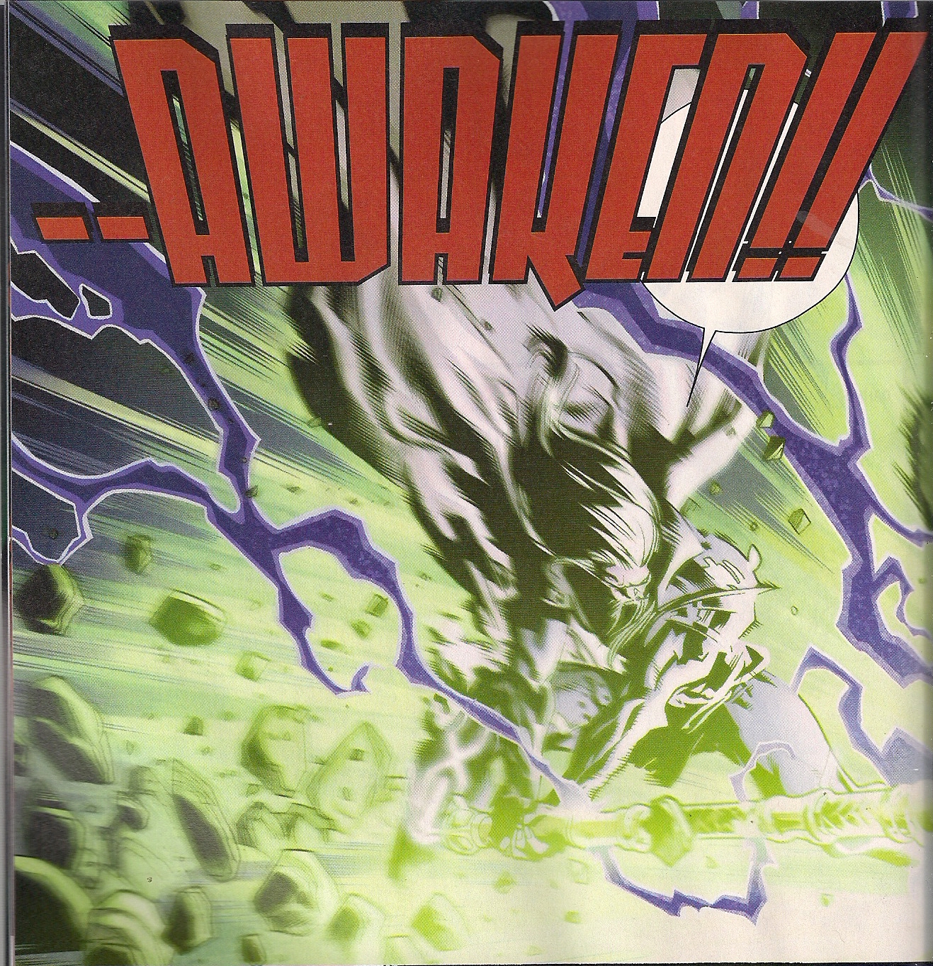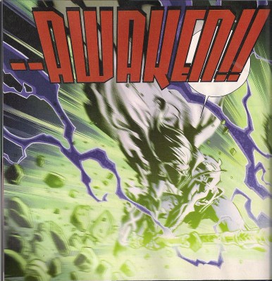 Laura Martin’s colours are stunning, while Chris Eliopoulos’s letters are nice’n’neat. There is one lettering problem, and it’s a big one. I don’t know if it was Eliopoulos, or Immonen, but when we’re getting a turn-the-page-for-the-giant-word moment, it should at least be readable.