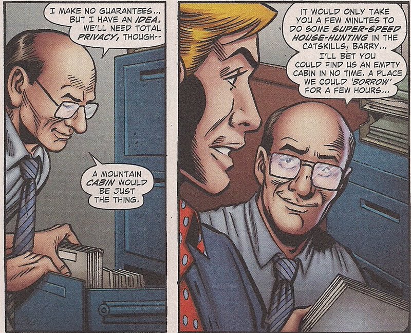 Oh yes, the disguise. How great is Wonder Woman’s look when she, Zee and Barry visit DC Comics? She’s jumped straight off the cover of issue #168 of her own book, back in the Sixties. And dig those flares on Barry!