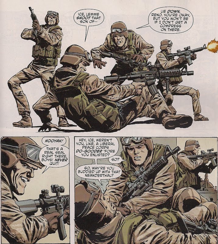 I don't get those quotes from Ivan Brandon about him not writing fights involving super-types, when there's patently one in there, DC has pushed the book as being about soldiers in a superhero universe, and he's taking part in interviews such as this: