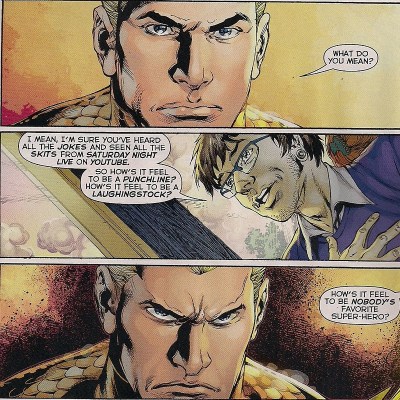Job done. Aquaman is, as they say, a ‘badass’. He’s stopped some bad guys and earned his lunch, fish and chips at the diner his dad used to take him to. And that’s when the book takes a misstep, though not a fatal one. Writer Geoff Johns is so keen to demonstrate that Aquaman deserves his place in the big leagues, alongside the likes of Superman, Batman and Wonder Woman, that he overeggs the pudding. He has a thoroughly annoying blogger (no, not me) interrupt Arthur Curry’s lunch to put it to him that, actually, he’s rather lame. That’s after the guy’s pal has forced him to explain that he doesn’t talk to fishes, he pushes them telepathically to do his will.