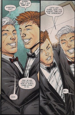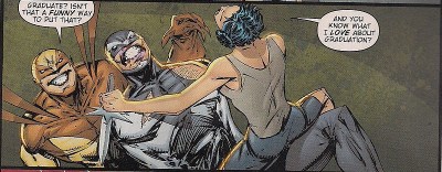 Still, it’s not like Liefeld is ruining a good story. The usually reliable Sterling Gates doesn’t move the Quirk business any further on, Dove’s Big Secret doesn’t come up … instead pages are wasted with unconvincing soap involving Dove’s boyfriend Deadman and the aforementioned Ren – both centred on inappropriate jealousy.
