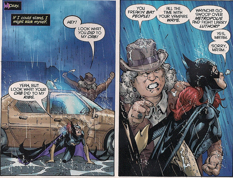 A few random points: I like that we get properly tagged scene transitions and signed editor’s notes. I don’t like that a newspaper would allow the phrase ‘two twin daughters.’ I’m intrigued that ‘Professor Stein’ of Firestorm has his name etched in huge letters on a subway car. And I just adore Gotham taxi drivers (cick to enlarge image).