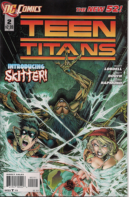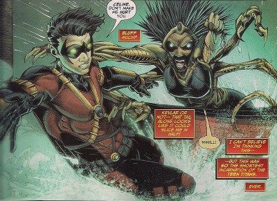There’s a nice moment in Scott Lobdell’s zippy script in which Tim bemoans the lurid jeans worn by Kids Today, but he seems totally fine with Cassie’s ridiculously skimpy boob tube. She claims her decolletage is real but I suspect it was stolen too, from Power Girl – Cassie truly puts the ‘tit’ in ‘Titans’. I really hope artist Brett Boobs – sorry, Booth, tones them down (though they do seem to be keeping Cassie from drowning on that cover).