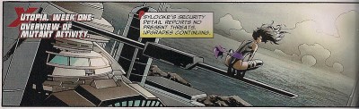 Indeed. Still, everyone decides to give Scott’s plan a crack, and as they wait for a suitably big menace to tackle, the Utopia community goes about its business: new mutants train; Dazzler’s ‘street team’ tackles San Francisco crime; the boffins of the X-Club upgrade Danger’s frankly terrifying head; Hope keeps an eye out for emerging mutants; and Psylocke squats to show off her arse … oh all right, she’s handling security and watching for threats, but I do get tired of ‘porno’ being her default pose.