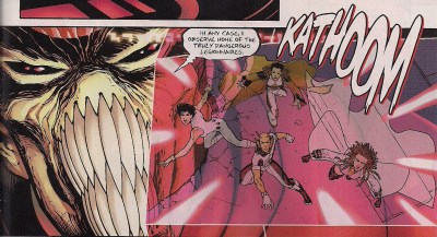 Wrong. Cham changes into a massive winged beast to attack the space destroyers, while Tinya uses her intangibility to first enter, then cripple, several ships. Chemical Kid throws himself into the fray, speeding up fuel reactions, while Dragonwing sprays firebreath and acid venom around.