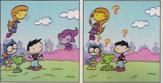 Yup, the enigmatic entity who helped the Flash tweak the DC Universe in Flashpoint #5 shows up here. Sort of. For older fans, it’s a cute nod to the universe-shaking shenanigans of the last few months. For young kids, it’s simply the Tiny Titans wondering who ‘the lady in purple’ is. They also get possibly their first lesson in the joys of comics confusion as Cyborg explains a rather big concept …