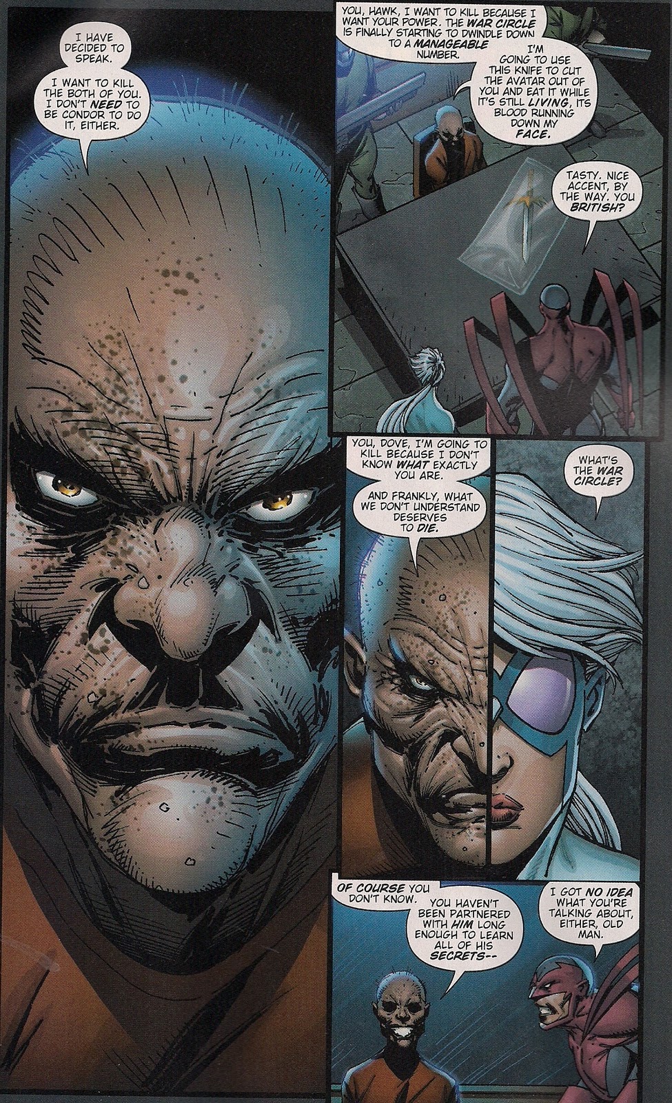 There are also mysteries – Condor claims to be 200 years old while Dawn insists she wasn’t always a peaceable type – and the usual action in the best issue of this series to date. The usual action there may be, but there’s less of it, allowing for the intrigue and plot movement mentioned above. And calmer things to draw seem to have slowed penciller Rob Liefeld down, bringing his best work yet. There’s no let-up in the dynamism of the fight scenes, but Liefeld also finds the drama in the quieter moments, using intelligent layouts and expressive bodies to bring the best out of Sterling Gates’ nicely measured script. Hawk still has the manic intensity, the killer grin, but the look is restrained, less warped.