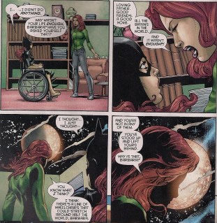 “Oh Barbara, get over it. Really, it’s beyond tiresome. An assault put you in a wheelchair, but you’ve had a miracle cure. Stop whining about it. Sure, there are still thousands of wheelchair users in the world, but you’re not betraying them by regaining the use of your legs – you never asked to be poster girl for differently abled vigilantes.”