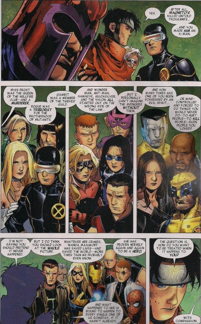 And X-Man Emma Frost isn’t having the Scarlet Witch, believed to have destroyed much of the mutant ‘race’, roaming free. She uses her mental power to shut Wanda down, instigating a conversation between Avengers old and Young, X-Men and X-Factor on the subject of forgiveness. Cyclops, leader of the X-Men, says he wishes to bring Wanda to ‘justice’, though he’s not too clear on what exactly that would mean. Her son Wiccan responds by demonstrating an ability rarely seen in Cyclops’ world: logic (click on image to enlarge).