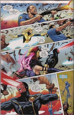 The much-maligned Greg Land turns in the best work I’ve seen from him for years – very few loony toothpaste ad model grins (Magick, and she is meant to be a little skewed) but plenty of action-appropriate poses. And he produces not simply isolated images, but proper storytelling. Like this page (click on image to enlarge):