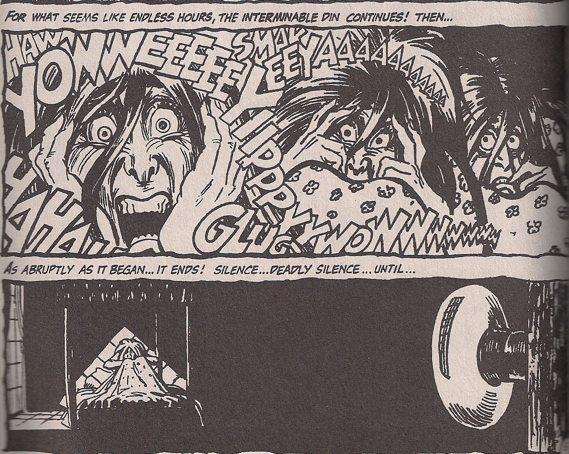 And then, it’s the cover story, as related by Mordred. A kindly looking domestic shows up at rich old Emily’s house, offering to clean the place for three days, ‘…just for the joy of being in this beautiful house’. And not only is she a first-rate domestic, Winfred also makes a mean cup of tea. Special tea. Tea so strong it sweeps Emily off her feet and into her sickbed. Soon, Winifred is turning away visitors – the cousin, the doctor, no one can get near. Until, on the third night, Emily hears noises. Locked in her room and weak, all she can do is drag herself to the keyhole and see the horrors without – witches and monsters … doing the Frug.