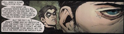 Rattled at the thought that the Court of Owls were nesting so close to home, Bruce gets terribly melodramatic about the city. Dick, bless him, basically tells Bruce to get a grip and quit being a daft old nelly. It’s just a shame Dick doesn’t smack him one back (click on image to enlarge).
